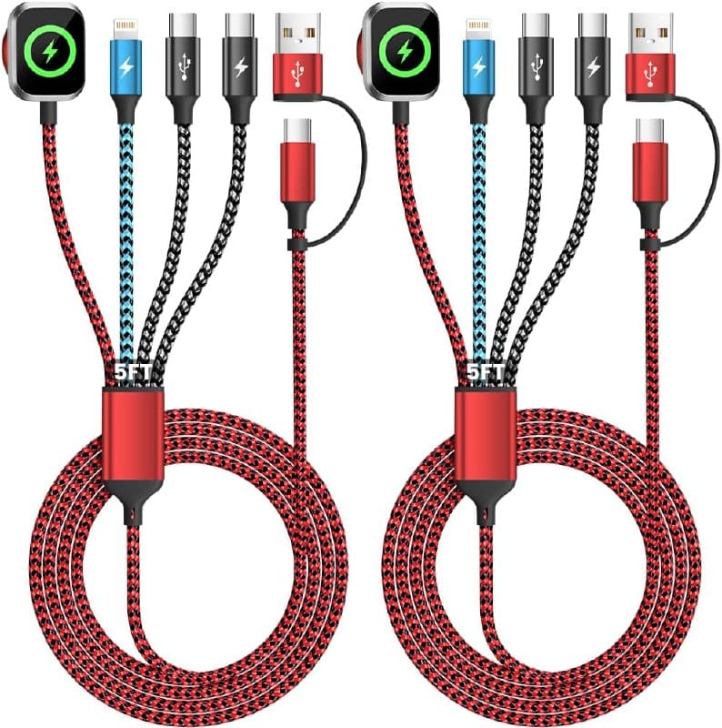 🔥Travel Essentials 4in2 Multi Charging Cable for iPhone Watch Charger,USB A/C to Dual Type C/IP/iWatch charger,Travel Chargers for Multiple Devices Compatible with iWatch Series&iPhone 17-12(2PACK,5FT)